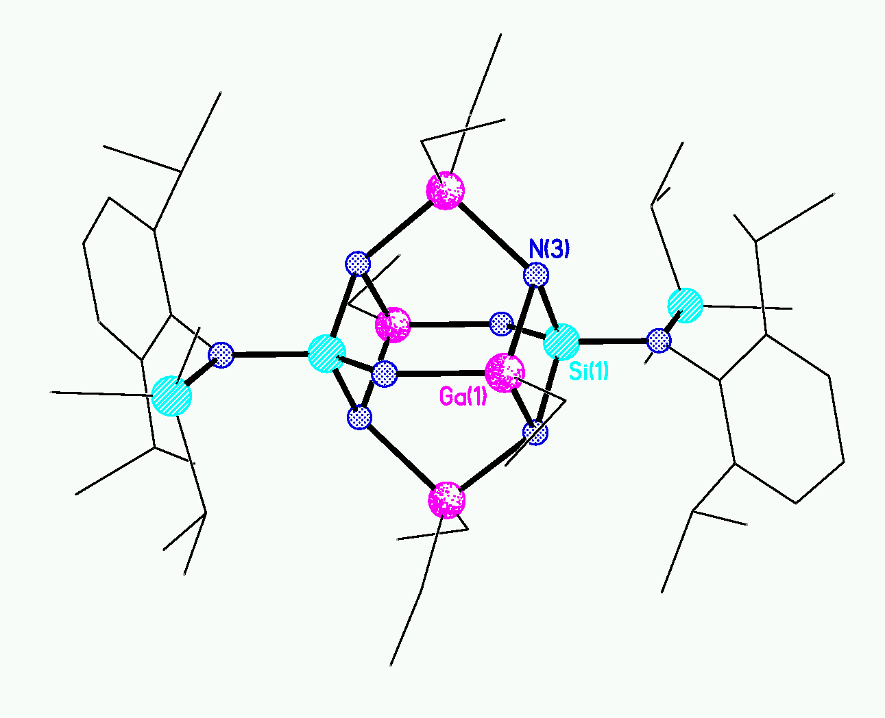 The M6N6 core in the moelcular structures of these metall-silazane-cages can be described as a bitruncated square bipyramid (tetraasteran-like; see H. M. Hutmacher, H. G. Fritz, H. Mussow, Angew. Chem., 78, 1975, 174). It is formed by four six-membered SiGa2N3-rings in the boat conformation, sharing the three stern-atoms and the three prow-aoms with each nighbour-ring. Thus, two planar four-membered SiGaN2-rings are formed. In all rings metall and nitrogen atoms occupate alternating sites.