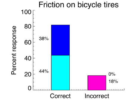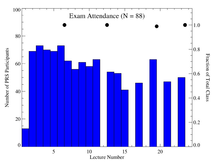 One of the objectives of the interactive learning was to engage the students in participating in lecture discussions, by making participation a small part of their final grade (2.5%). Traditional lecture attendance has been known to taper off to <50% in previous semester. As shown in the figure at left, the participation rate through the clickers dropped to roughly this number by mid-semester, reflecting either comparable levels of lecture attendance or loss of/forgetting clickers. In any case, it appears that the use of the clickers, along with grade enticement, had little effect in keeping attendance much above prior levels.