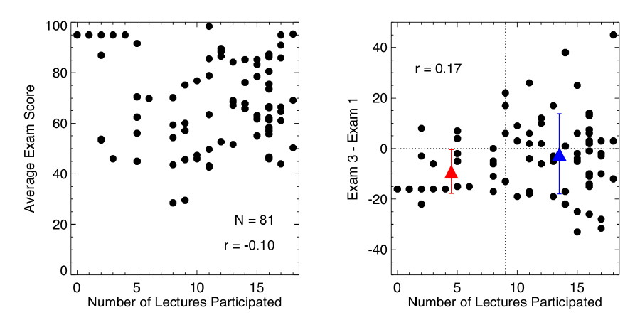 Did participation in the concept questions correlate with other proficiency metrics, such as performance on exams? The figure to the left indicates that the correlation is weak. Average exam scores compared to lecture participation (left) shows a very weak inverse correlation (Pearson rank coefficient r = -0.10). Improvement in exam performance (3rd exam score minus 1st exam score) shows a slightly more significant positive correlation with participation (r = 0.17), with the students showing the largest improvement in exam scores participating the most. Yet the mean change in exam score was essentially identical between frequent (-2±16%) and infrequent participants (-9%±9%). Hence, there is a suggestion of exam performance tracking with participation in in-class concept discussions, but the correlation is weak.