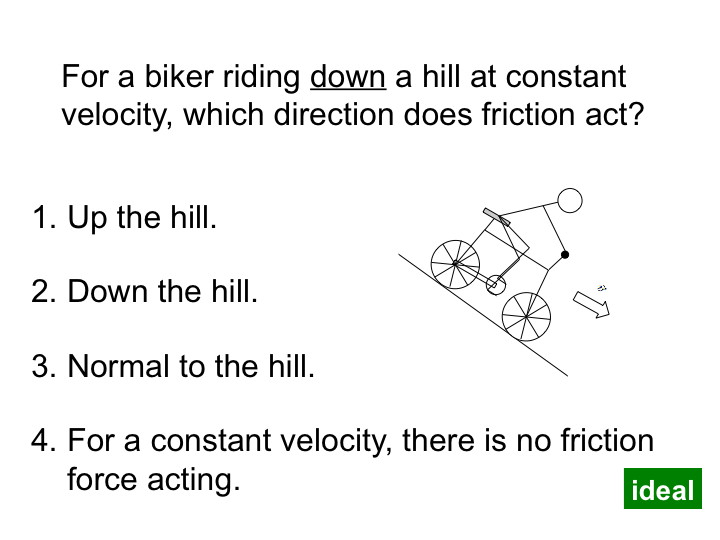 A total of 30 new concepttests were designed, with the aim of challenging the conceptual understanding while fostering discussion in the classroom. Questions were designed following two methodologies: (1) 3-question sequences of increasing complexity and (2) single challenge questions of sufficient difficulty to trigger disagreement and discussion. In a typical discussion sequence, the students are polled and if the results show near-unanimity for the correct response (say >65-75%) then the lecture moves on to the next topic. If there is a broader mix, then students are instructed to "convince their neighbors" of their solution by explaining their physical reasoning. The students are then re-polled to see if there is a change in the overall consensus. If a disparity remains, additional tactics such as advocacy (having individual students advocate for their given answers), ruling out incorrect options (if votes are split between three or more choices) and as a last resort guided discussion (steering students to the appropriate concepts) are used. The students by and large arrived at the correct conceptual idea with little or no input from the me.