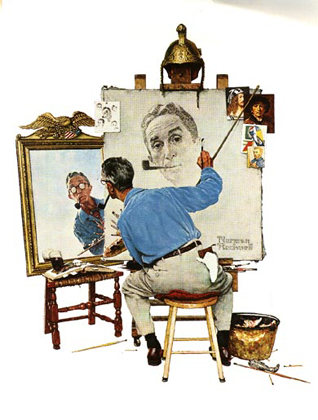 A woman sits, her back to you, looking in a mirror and drawing a portrait. The ``real'' woman's face in the mirror is pale and skeletal from illness, and her hands bony. She wears a robe (much like Cassandra's shift), with a faded circle of green and blue, over which are five stars in a peculiar pattern. She holds a palette with only red, green, and blue on it. In the painting she draws, a strong and tall Cassandra, dressed in the hyperstatic float-enabled dress paints on yet another canvas; the crew is before her, posing, and she paints something in bright primary colors. Tacked up about the edge of the large canvas are sketches and pictures matching some of her other paintings. (See the Rockwell self-portrait for the approximate setup).