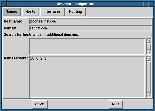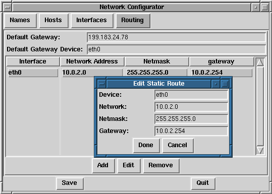 The network configuration tool (netcfg) shown in Figure 32 is designed to allow easy manipulation of parameters such as IP address, gateway address, and network address, as well as name servers and /etc/hosts.