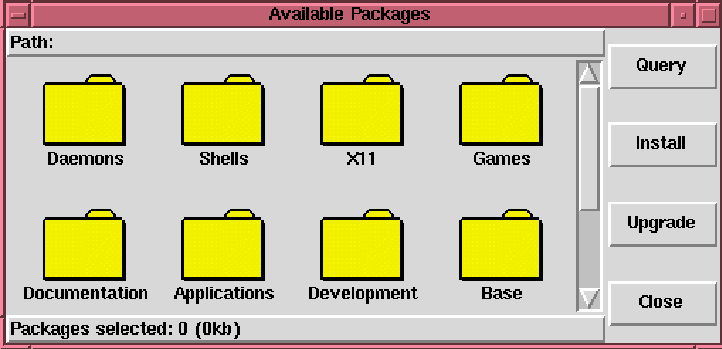 Each folder icon in glint represents a group of packages. Each group can contain other groups, which allows for flexible locations of packages. Groups are used to place packages that perform similar functions in similar locations. For example, Red Hat includes many application programs such as editors and spreadsheets. All of the text based ones appear in the ``Applications'' group. Inside of that group, there is another grouping for all of the editors that are shipped.