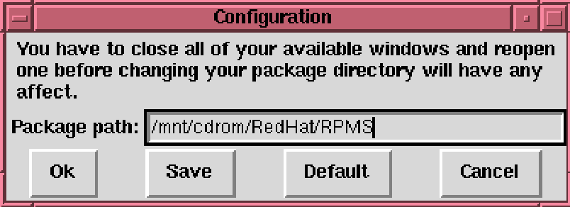To change this path, first be sure to close all of the windows listing available packages you may have open. Then choose the Configuration option from one of the remaining windows. This will open a dialog box like the one shown in figure 45. Here you can type the full path to the RPMs you'd like to look at. Choosing the Save button will save this path, making it the default for future glint sessions. The Default button restores the path to the one that glint used when it started.