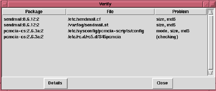 The three columns in this window describe the package with a problem in it, the file that has the problem, and a brief description of the discrepancies that were found. While the check is running, the current file being checked appears as the last element in the list, and the problem is listed as (checking). A full list of the problems that can be found through verification appears in figure 49.