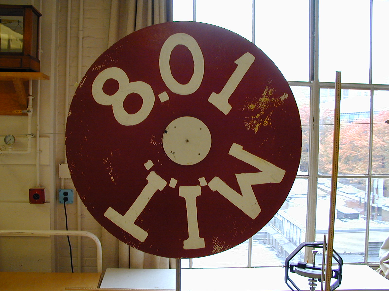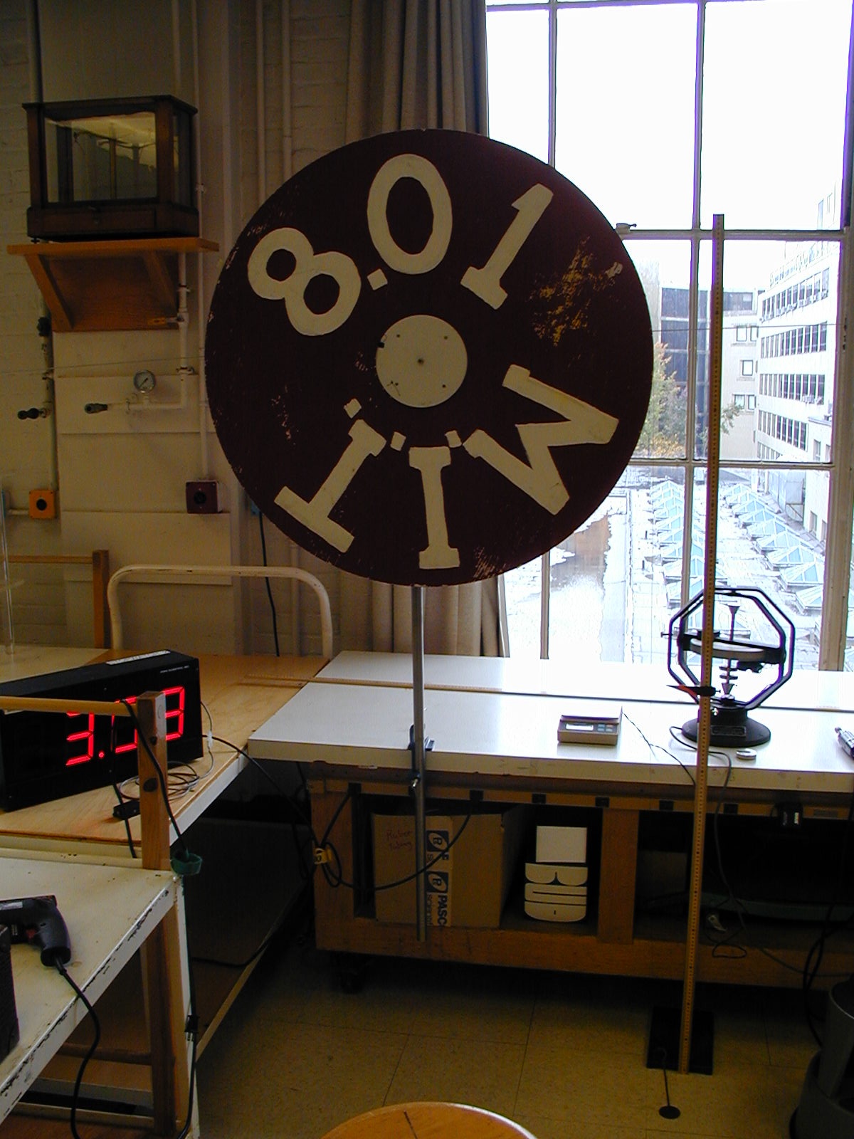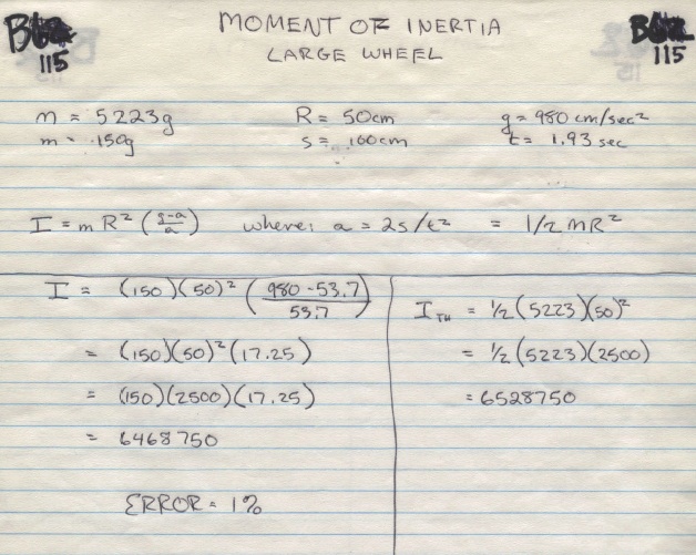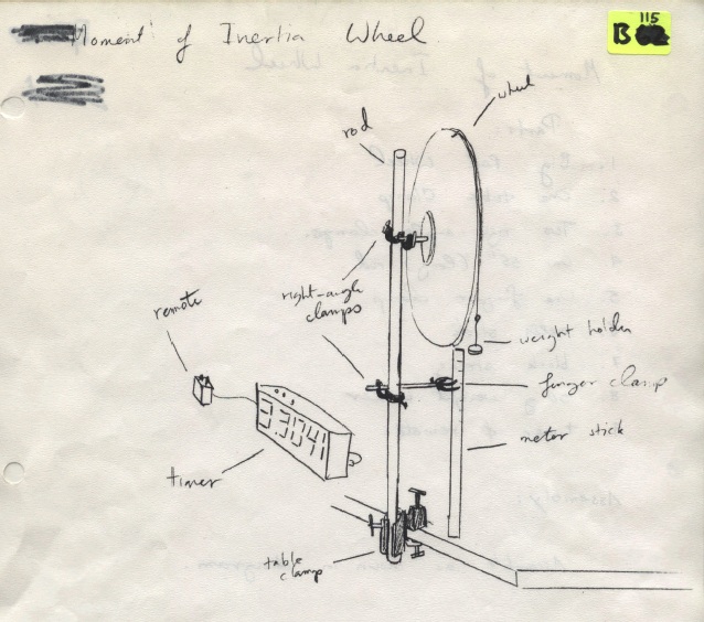 A weight is attached to a string wrapped around the rim of a wheel. The weight falls and spins the wheel. The wheel's moment of inertia is calculated by modelling it as a hoop. The calculated and measured time for the mass to fall can then be compared.
