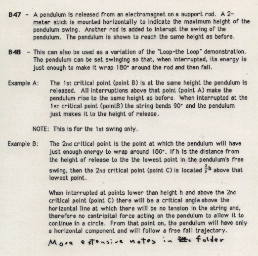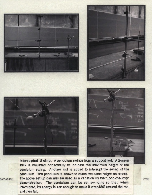 A pendulum swings from a support rod. A 2 meter stick is mounted horizontally to indicate the maximum height of the pendulum swing. Another rod is added to interrupt the swing of the pendulum. The pendulum is shown to reach the same height as before. The above set up can also be used as a variation on the “loop-the-loop” demonstration. The pendulum can be set swinging so that, when interrupted, its energy is just enough to make it 180° around the rod, and then fall.