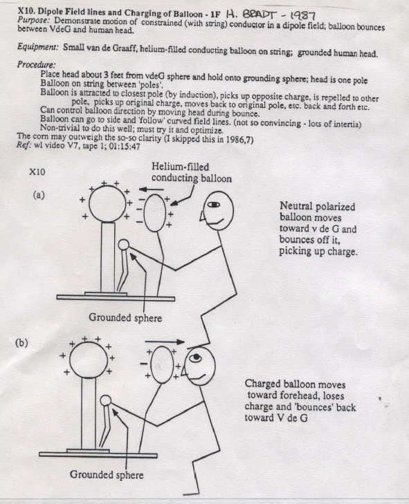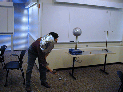 A conducting helium-filled balloon bounces repeatedly between the top of a VdG generator and the grounded head of the demonstrator. At the correct distance, the balloon will follow the electric field lines.