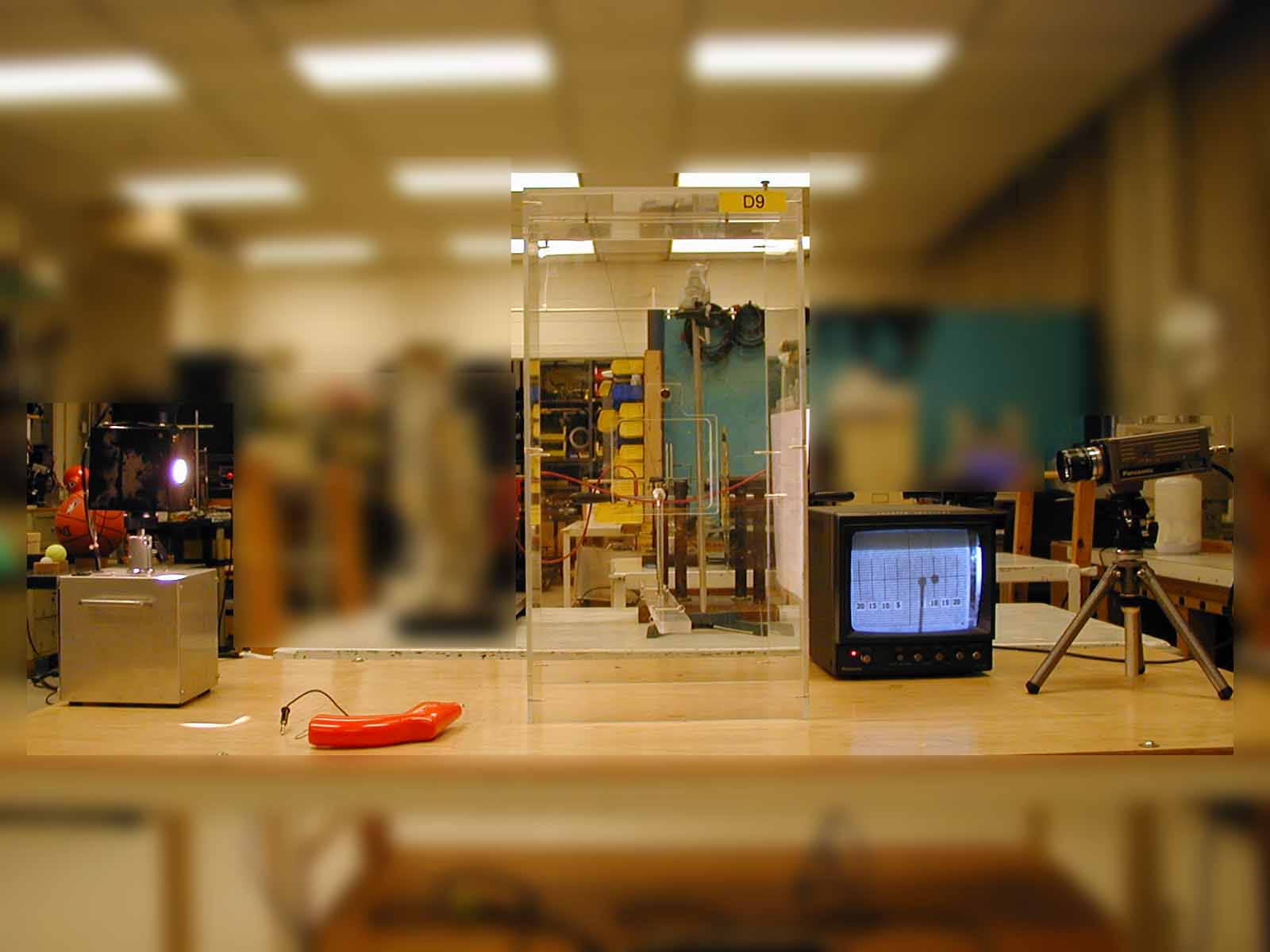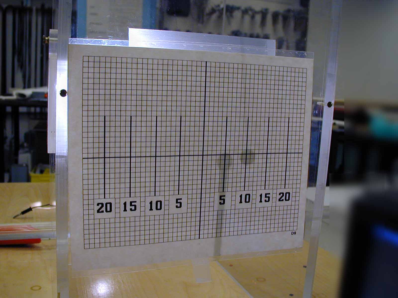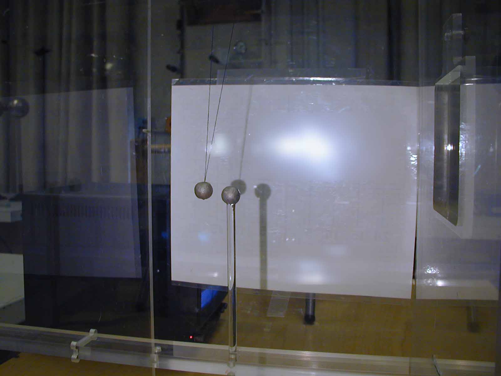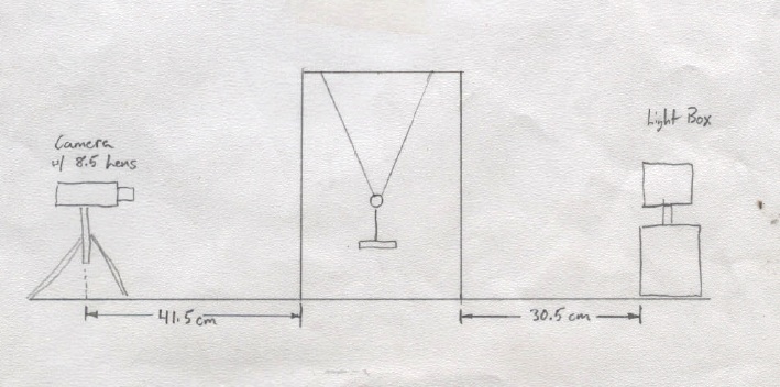 Place plexiglass enclosure in front of lamp with graph paper facing away from lamp. Place camera on tripod facing the graph paper and project the video image. The shadow of the pith balls should appear clearly on video when lights are turned low. Be sure to align the lamp, plexiglass enclosure, and camera such that any paralax effects are minimized.