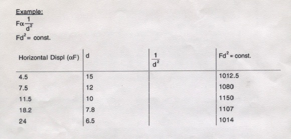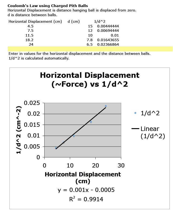 Here is an example of an excel worksheet configured to plot Horizontal Displacement (a.k.a. Force) vs distance between the balls, represented with sample data in this image: