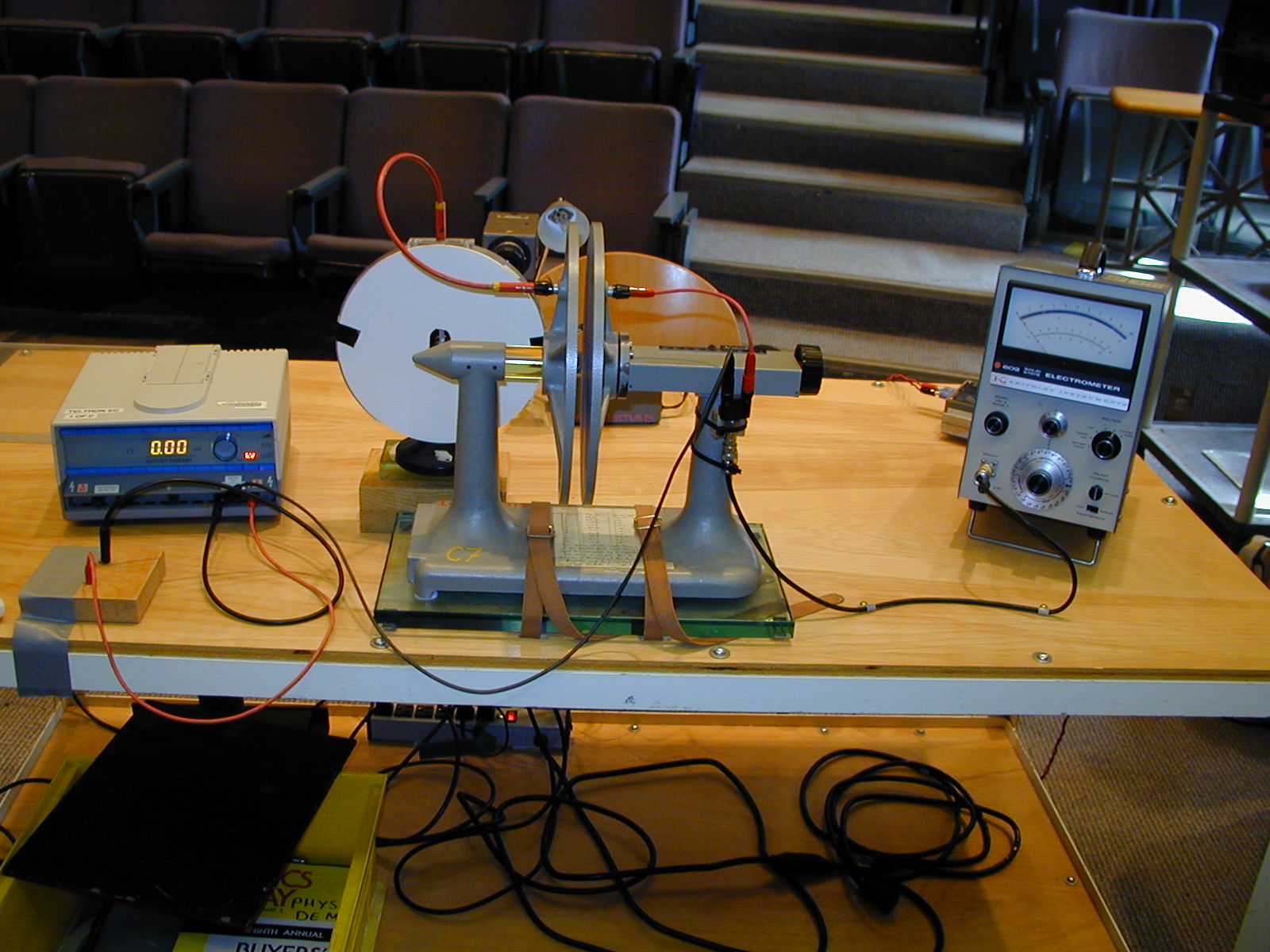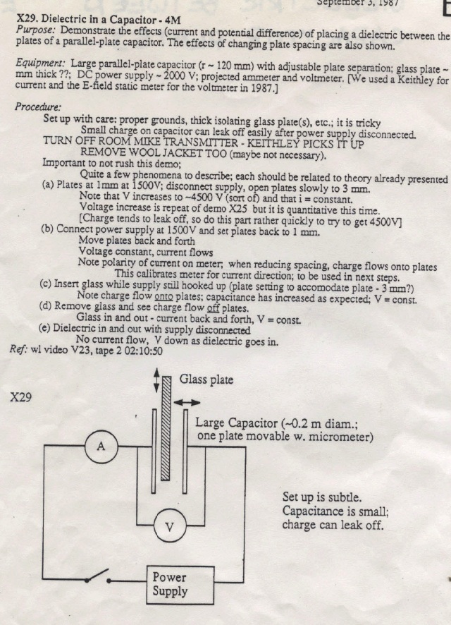 A glass dielectric is placed between the plates of a charged parallel plate capacitor. The Keithey Electrometer is used to observe the current. The Braun electroscope is across the plates to observe the change in potential difference as the plate spacing is varied.