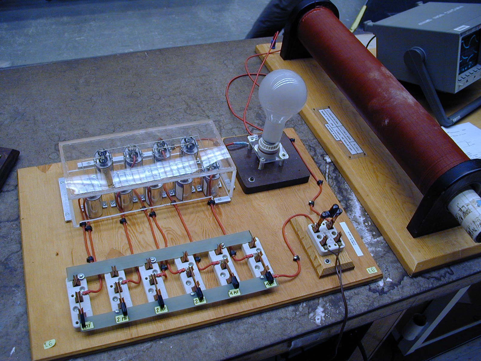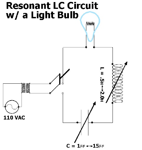 A series circuit consisting of a large solenoid, a variable capacitor, and a 200W lignt bulb is connected through a knife switch to 120 VDC. The inductance of the solenoid can be varied from about .1 H to 1 H by inserting an iron core, and the capacitance can also be changed from 1 µF to 15 µF. If the switch is thrown and the iron core slowly inserted in the solenoid, the cirucit will resonate at some point and the bulb will light up. This process is repeated for different values of the capacitor.
