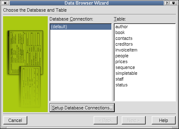 The 'Choose the Database and Table' wizard page appears first. The available databases are displayed in the 'Database Connection' listbox. Choose a connection by clicking it. If there are no connections listed in the listbox, click Setup Database Connections to invoke the Edit Database Connections Dialog. The 'Table' listbox shows all the tables and views that are available through the selected database connection. Select a table or view by clicking it.
