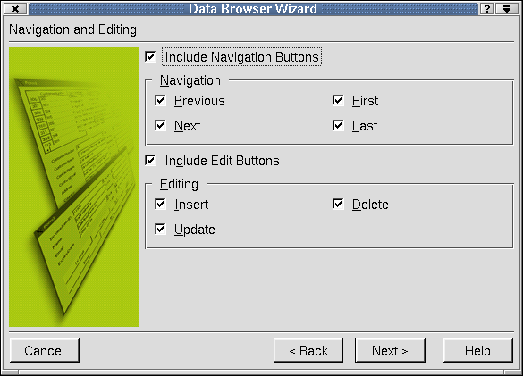 The 'Navigation and Editing' wizard page is used to create navigation and editing buttons.