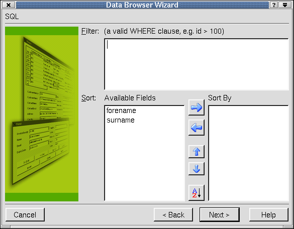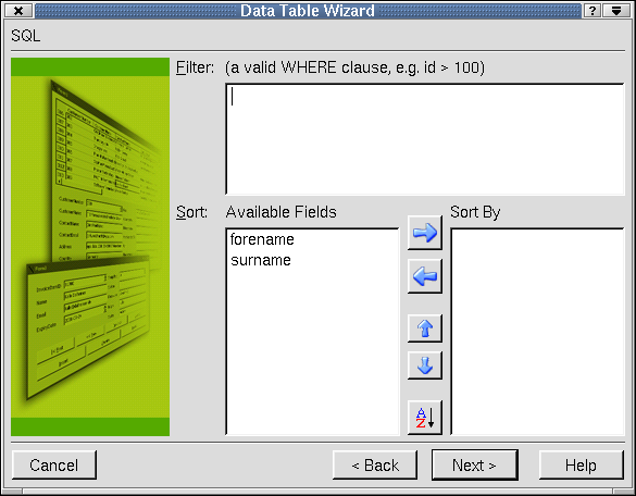 The 'SQL' wizard page is used to apply filters and sorts to the data in the table. Click the 'Filter' line edit and enter a valid SQL WHERE clause without the WHERE keyword. The filter applies to the data shown in the table.