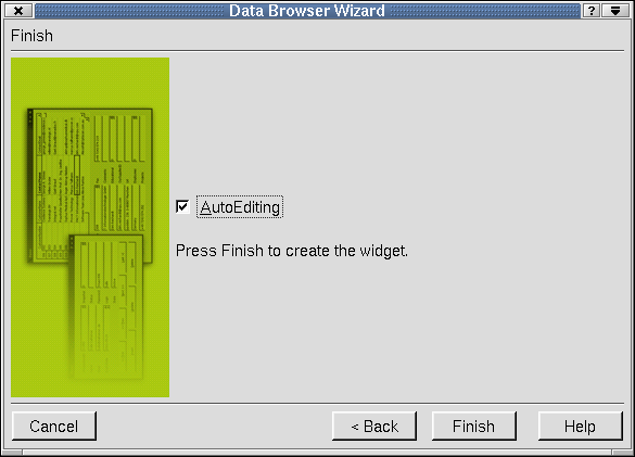 The 'Finish' wizard page is used to select auto-editing and to leave the wizard. If you want user edits, e.g. inserts and updates, to be automatically applied when the user navigates to another record, check the 'AutoEditing' checkbox. If 'AutoEditing' is unchecked, users must press Enter to confirm their edit before moving to another record, or their edit will be lost. This property can be changed later if desired.
