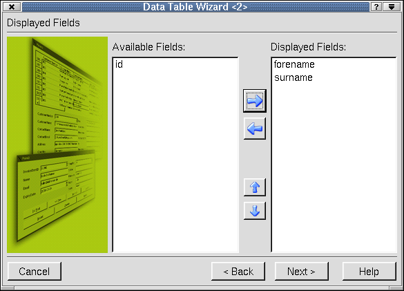 The 'Displayed Fields' wizard page is used to select fields that will be displayed in the table. By default, every field except the table or view's primary key, is initially placed in the 'Displayed Fields' list. Click the blue left and right arrow buttons to move fields from the 'Available Fields' listbox and into or out of the 'Displayed Fields' listbox. Click the blue up and down arrow buttons to move fields up and down within the 'Displayed Fields' listbox. The order in which fields appear in the 'Displayed Fields' listbox is the order they are shown in the Data Table, with the top-most field being in the left-most column.