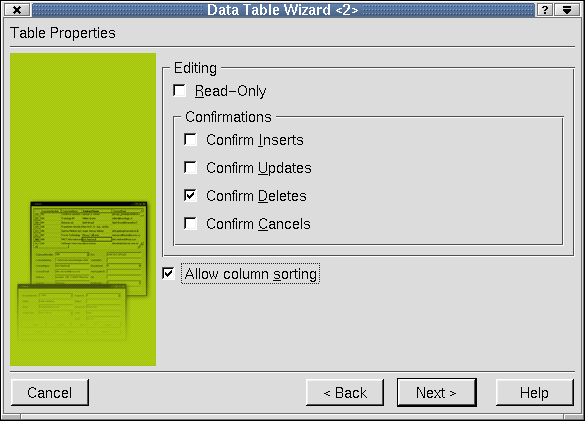 The 'Table Properties' wizard page is used to set the Data Table's initial editing options. Check the 'Read-Only' checkbox to prevent records from being edited, deleted or added. Check the checkboxes in the 'Confirmations' section to force the user to confirm their changes. By default users must confirm deletions. Click 'Allow column sorting' to allow the user to sort the data by clicking a column's header (which displays the field name).