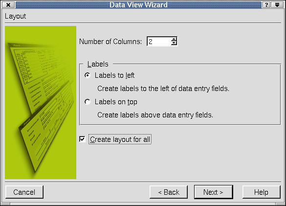 The 'Layout' wizard page is used to design the layout of the data view. To choose the number of columns the form will use, click the 'Number of Columns' spinbox. To make labels appear to the left of the data entry fields, click the 'Labels to left' radio button. To make labels appear above the data entry fields, click the 'Labels on top' radio button.