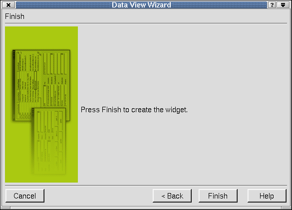 The Data View wizard is automatically invoked by clicking the dataview widget and placing it on the form. The Dataview widget is used to create a read-only form view of database data.