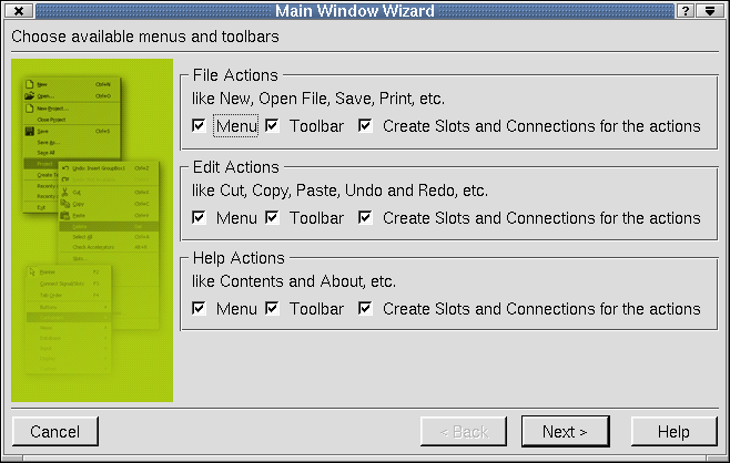 The 'Choose available menus and toolbars' wizard page appears first. It presents three categories of default actions, File Actions, Edit Actions and Help Actions. For each category you can choose to have Qt Designer create menu items, toolbar buttons and signal/slots connections for the relevant actions. You can always add or delete actions, menu items, toolbar buttons and connections later. Check or uncheck the checkboxes to reflect your preferences.