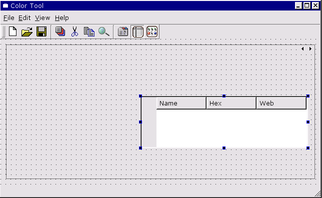 This application presents the user with a view of a set of colors and their names. We will provide two views (using a QWidgetStack) which the user can switch between. The tabular view will show each color as a small square followed by its name and hex value. It will also provide the option of an indicator to show whether or not the color is one of the 216 standard web colors. The iconic view will show each color as a circular color swatch with the name of the color beneath.
