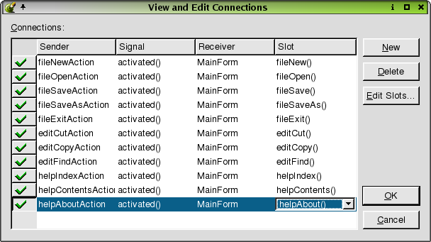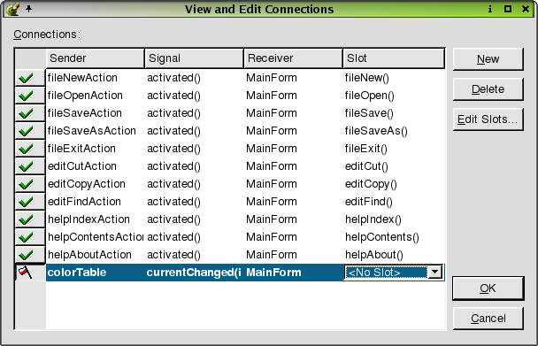 The main window wizard created a few slots and actions that are not relevant to our application, so we'll delete them.