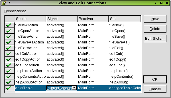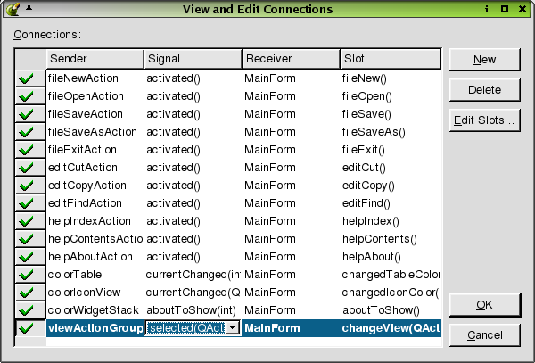 In the original version of Qt Designer if you wanted to provide code for a form you had to subclass the form and put your code in the subclass. This version fully supports the subclassing approach, but now provides an alternative: placing your code directly into forms. Writing code in Qt Designer is not quite the same as subclassing, for example you cannot get direct access to the form's constructor or destructor. If you need code to be executed by the constructor create a slot called void init(); if it exists it will be called from the constructor. Similarly, if you need to be executed before destruction create a slot called void destroy(). You can also add your own class variables which will be put in the generated constructor's code, and you can add forward declarations and any includes you require. To add a variable or declaration, right click the appropriate item, e.g. Class Variables, then click New then enter your text, e.g. QString m_filename. If one or more items exist, right clicking will popup a menu that has New, Edit and Delete options. If you want to enter multiple items, e.g. multiple include files or multiple data members, it is easiest to right click in the relevant section, then click Edit to invoke an Edit dialog. To edit code, just click the name of a function to invoke the code editor. Code editing and creating slots are covered later.