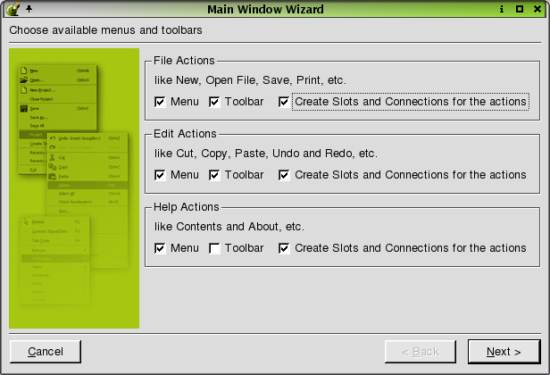 The Choose available menus and toolbars wizard page appears first. It presents three categories of default actions, File Actions, Edit Actions and Help Actions. For each category you can choose to have Qt Designer create menu items, toolbar buttons and signal/slots connections for the relevant actions. You can always add or delete actions, menu items, toolbar buttons and connections later.