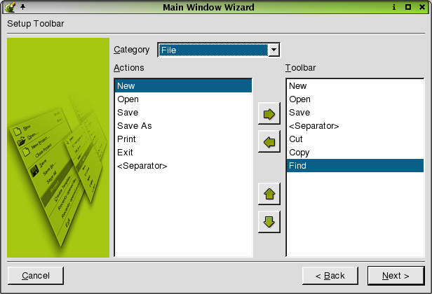 The Setup Toolbar wizard page is used to populate a toolbar with actions from each of the default action categories. The Category combobox is used to select which set of actions you wish to work on. The Actions list box lists the actions available for the current category. The Toolbar listbox lists the toolbar buttons you want to create. The blue left and right arrow buttons are used to move actions into or out of the Toolbar list box. The blue up and down arrow buttons are used to move actions up and down within the Toolbar list box. Note that the '<Separator>' item in the Actions list box may be moved to the Toolbar list box as often as required and will cause a separator to appear in the finished toolbar.