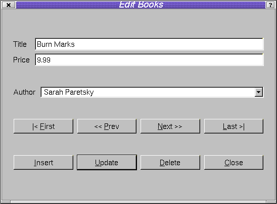 Now when we navigate through the author and book records in the BookForm we can click the Edit Books button to launch our Edit Books dialog. Although the dialog supports UPDATE, DELETE and navigation over the book table, we cannot edit the foreign keys nor perform inserts. We will deal with insertion in the same way as we did with the QDataTable, then we will handle the foreign key relationship to author.