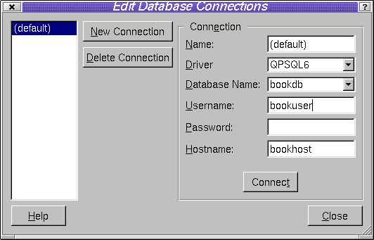 Choose Project|Database Connections from the menu bar. The Database Connections dialog will appear. Click New Connection. For applications that use a single database it will probably be most convenient to use the default connection name of '(default)'. If you use more than one database then each one must be given a unique name. A driver must be chosen from the Driver combo box. The database name may be available in the Database Name combo box or may have to be typed in. The database name, username, password and hostname should be provided by your database system administrator. When the Connection information has been completed click Connect. If the connection is made the connection name will appear in the list box on the left hand side of the dialog. You can now close the dialog; the connection settings will remain in effect until you change or delete them or exit from Qt Designer.