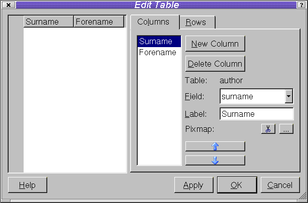 In most relational databases tables contain fields which are foreign keys into other tables. In our 'book' database example the authorid in the book table is a foreign key into the author table. When we present a form to the end user we do not usually want the foreign key itself to be visible but rather the text associated with it. Thus, we would want the author's name to appear rather than the author id when we show book information. In many databases, this can be achieved by using a view. See your database's documentation for details.