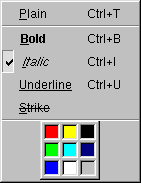 Note that you can insert pixmaps or bitmaps as items into a popup menu without needing to create a QCustomMenuItem. However, custom menu items offer more flexibility, and -- especially important with Windows style -- provide the possibility of drawing the item with a different color when it is highlighted.