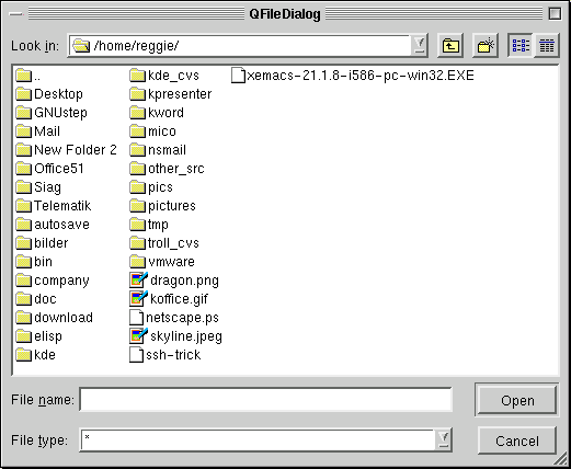 In the above example, a modal QFileDialog is created using a static function. The startup directory is set to "/home". The file filter is set to "Images (*.png *.xpm *.jpg)". The parent of the file dialog is set to this and it is given the identification name - "open file dialog". The caption at the top of file dialog is set to "Choose a file". If you want to use multiple filters, separate each one with two semi-colons, e.g.