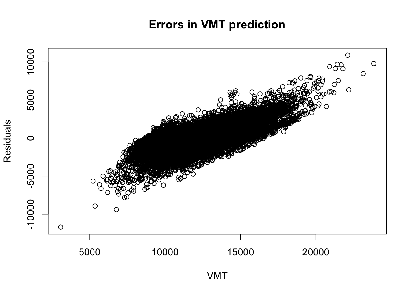 The scatterplots suggest that residuals and VMT are correlated—they are high or low together. This suggests that the adjustments to annual mileage that are associated with out factors may be better modeled as percentage changes rather than absolute value differences. With this in mind, we might consider fitting a model of log(VMT).