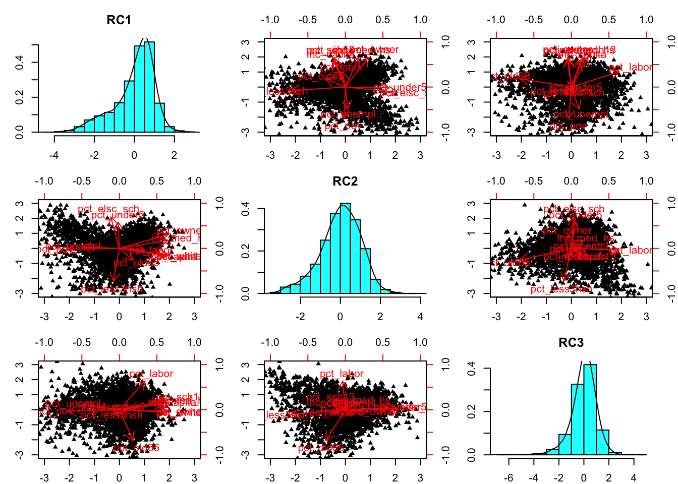 The histograms show the distribution of each component across all block groups. The scatterplots use pairs of the 3 components along the X-Y axes and superimpose the axes showing high/low directions for each of the original variables.