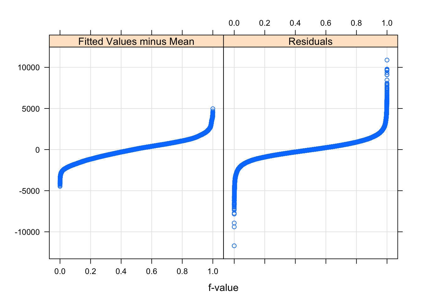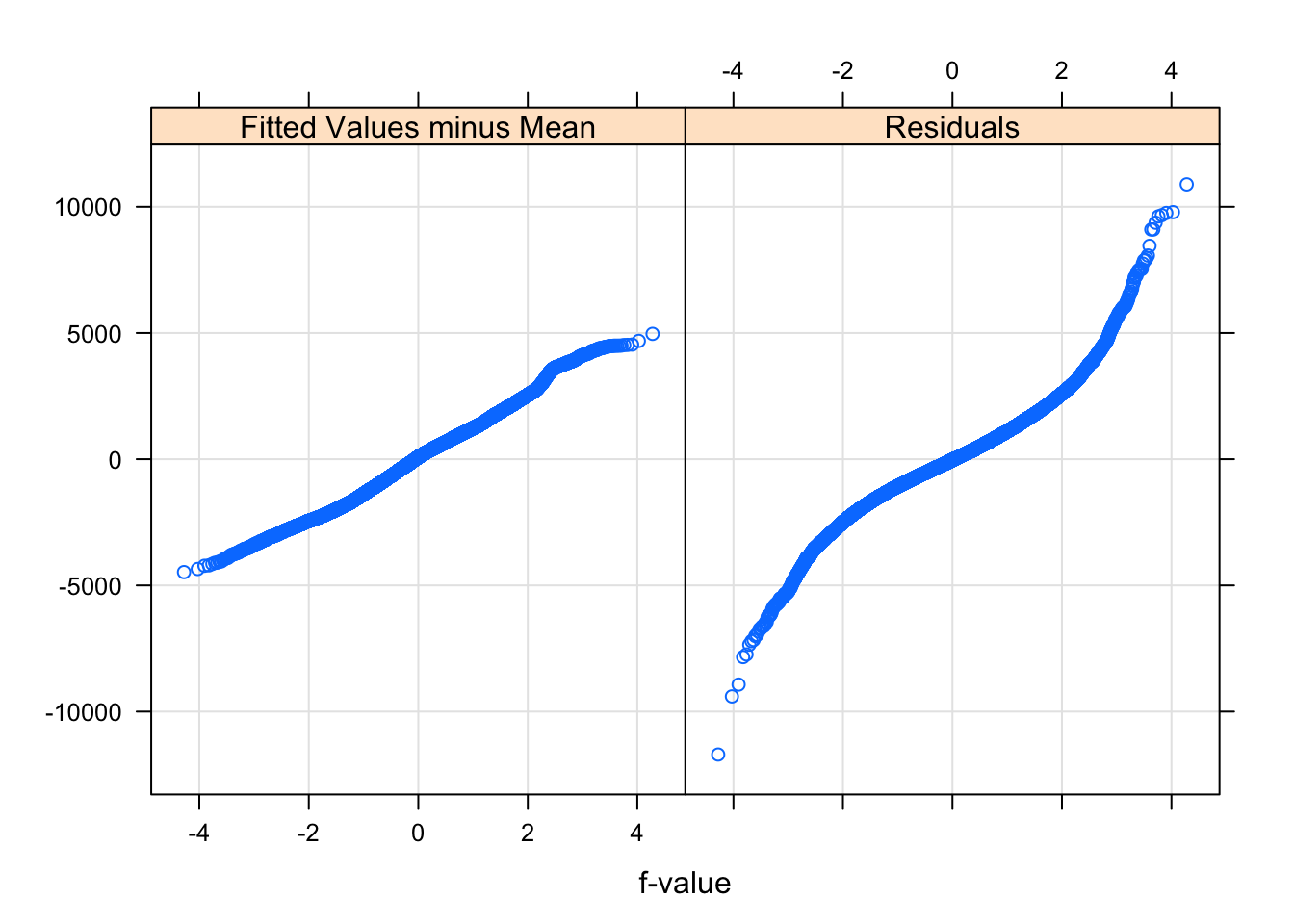 We might also want to use additional R tools to plot fitted values and residuals in order to check some of the model assumptions. The first quantile-quantile plot of fits and residuals assumes a uniform distribution and the second pair assumes a normal distribution. If the data follow the assumed distribution, then the plots will be linear. The fitted values look close to normal but the residuals are both widely varying and less normal.
