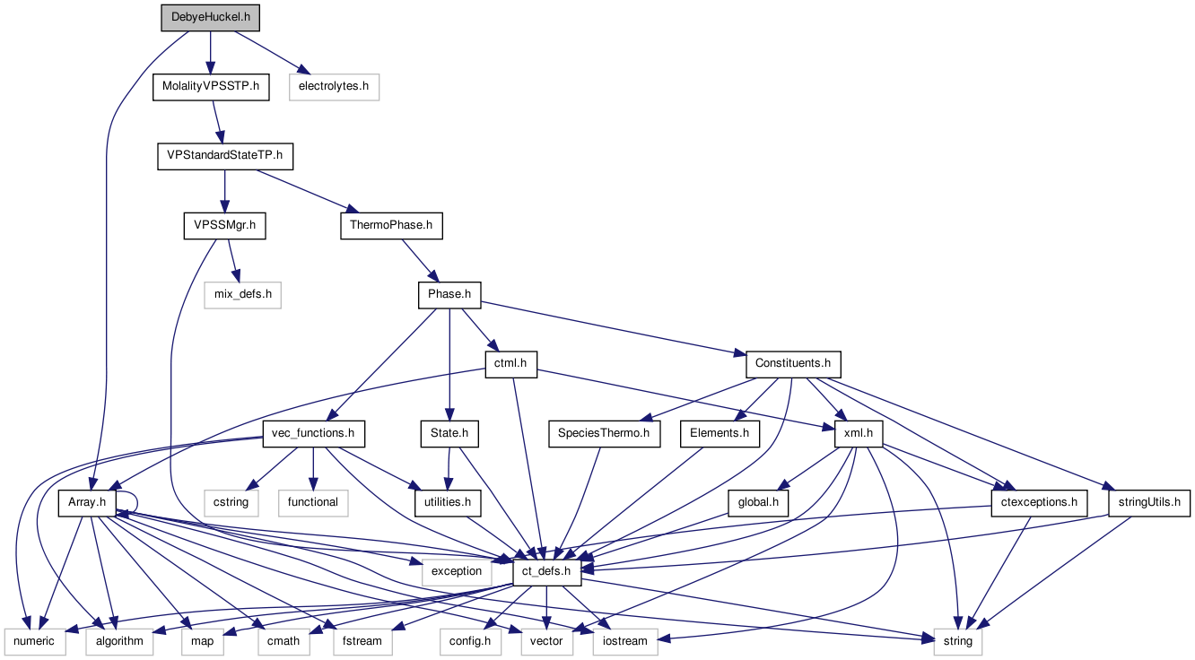 Headers for the DebyeHuckel ThermoPhase object, which models dilute electrolyte solutions (see Thermodynamic Properties and DebyeHuckel ) .