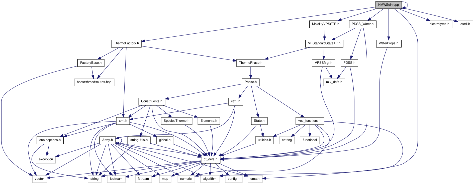 Definitions for the HMWSoln ThermoPhase object, which models concentrated electrolyte solutions (see Thermodynamic Properties and HMWSoln ) . More...