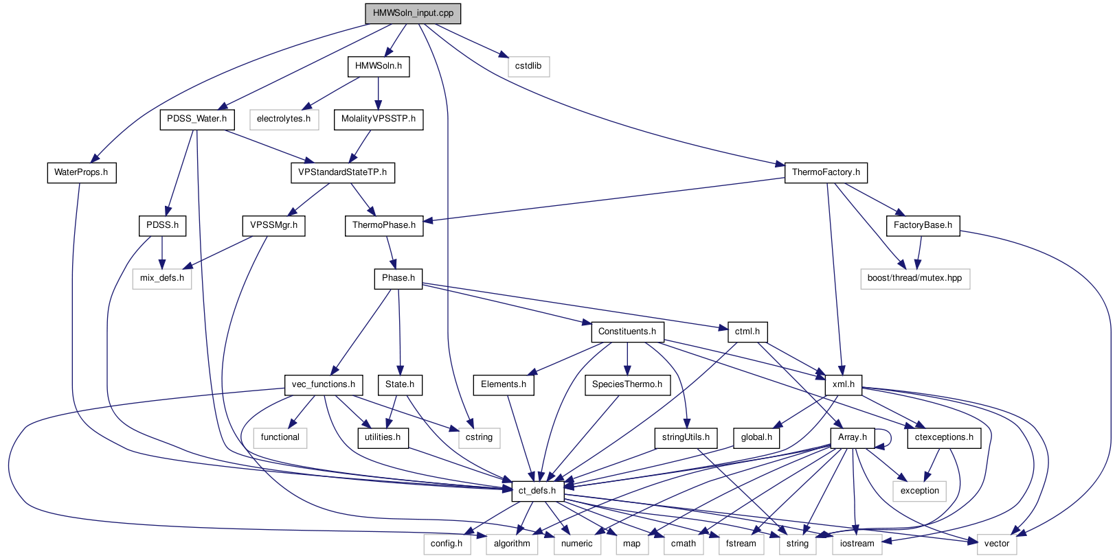 Definitions for the HMWSoln ThermoPhase object, which models concentrated electrolyte solutions (see Thermodynamic Properties and HMWSoln ) . More...