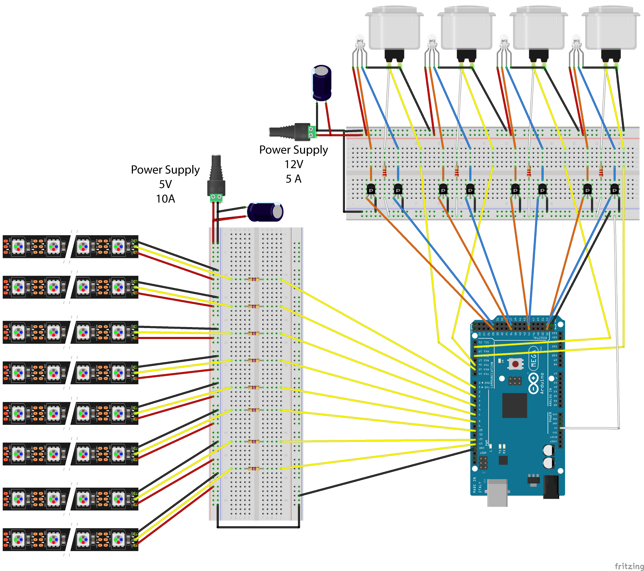 On the back side of the wall, we integrated the “brain” of the gameplay, the Arduino Mega board, which is fully capable of integrating, synchronizing and operating the multiple electrical components of the gameplay. For ease of debugging and re-wiring, we established the electrical connections via breadboards (one for the buttons and another for the LED strips). In the breadboard dedicated to the buttons, a series of n-channel mosfets (black cap transistors in the diagram) were connected to the blue/red color connections of the Suzohapp button and the digital pins of the Arduino to control the ON/OFF state of these colors during the gameplay. Additionally, the micro-switch system of the button was connected to the 5V supply of the Arduino and a communication pin which signaled the Arduino when the buttons was pressed. Note from the diagram, that the 5V connections to each button required a 220 ohms resistor per button connection. For the breadboard with the LED strips, a simpler connection was required to the Arduino with only a connection to the PWM pin from the Arduino to each strip (intermediated by a 470 ohms resistor) to control the light dynamics of each strip. As a safety precaution to avoid the initial onrush of current from damaging the electrical components, a large capacitor (1000 µF) across the + and – terminals was added for each power supply. For the purposes of our presentation, we powered the Arduino directly form the USB computer connection but external power sources are also viable.