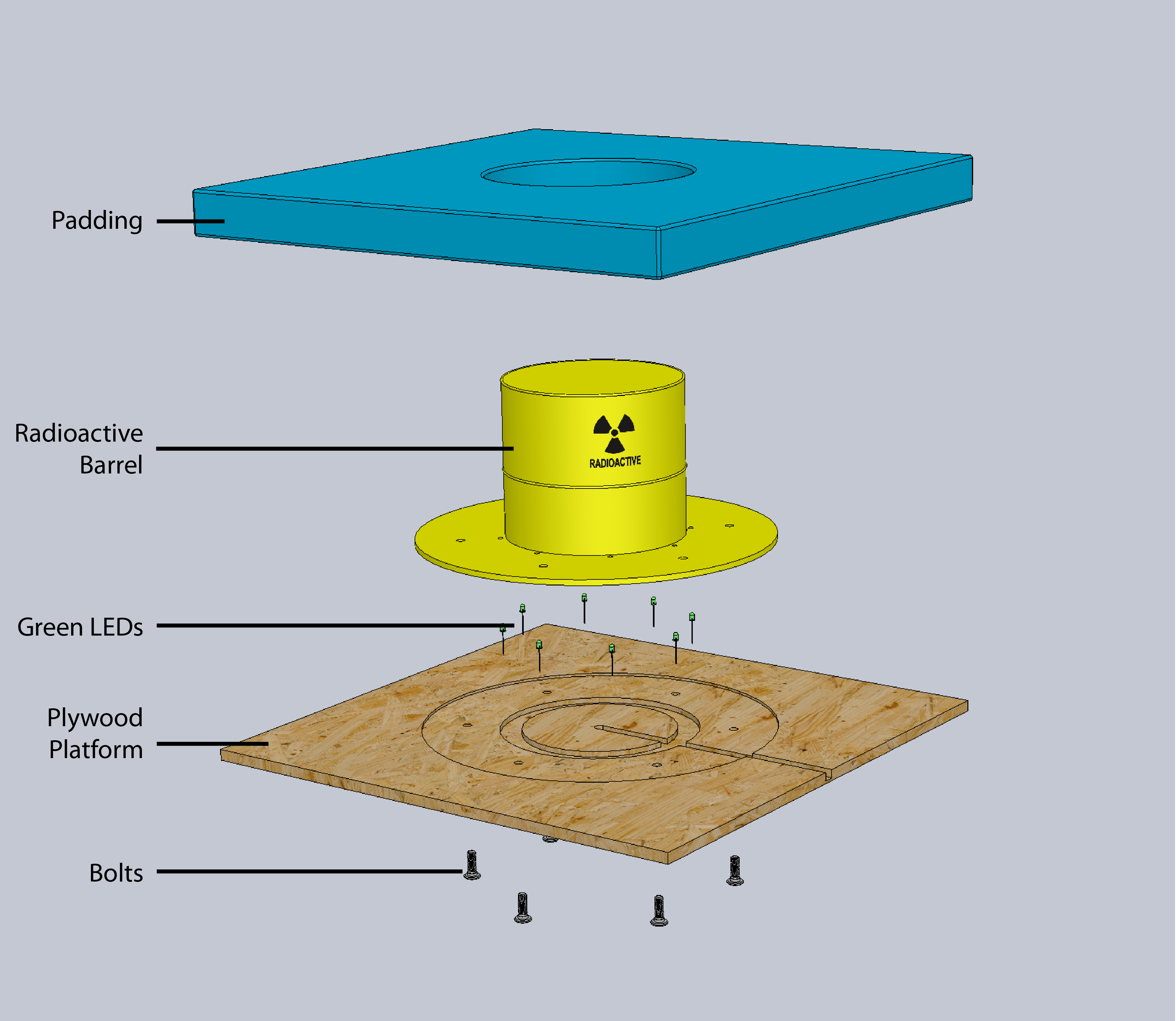 Players will traverse the room by stepping from barrel to barrel. The barrels are constructed out of steel, and are painted yellow to resemble large drums of radioactive waste. To stay in place, barrels are bolted onto a plywood platform which would span the floor of the room, and can be weighed down to add more stability.