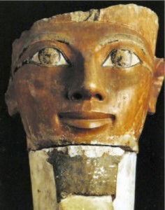 | Statues and paintings of Hatshepsut show her facial features and body form with feminine attributes, and later with masculine attributes. In earlier statuary, her femininity is highlighted by an oval face, the soft arch of her eyebrows and eyes, the presence of bosoms, shapely hips, and rounded shoulders. These womanly features disappear over time as she later becomes featured as a flat-chested male pharaoh. In her full male form, Hatshepsut's statues were painted a unique orange skin tone, a mix between the deep red pigment used for painting men and the lighter yellow pigment used for painting women. The interesting shift toward a more masculine portrayal of Hatshepsut is also shown through the type of clothing she is depicted wearing. |
