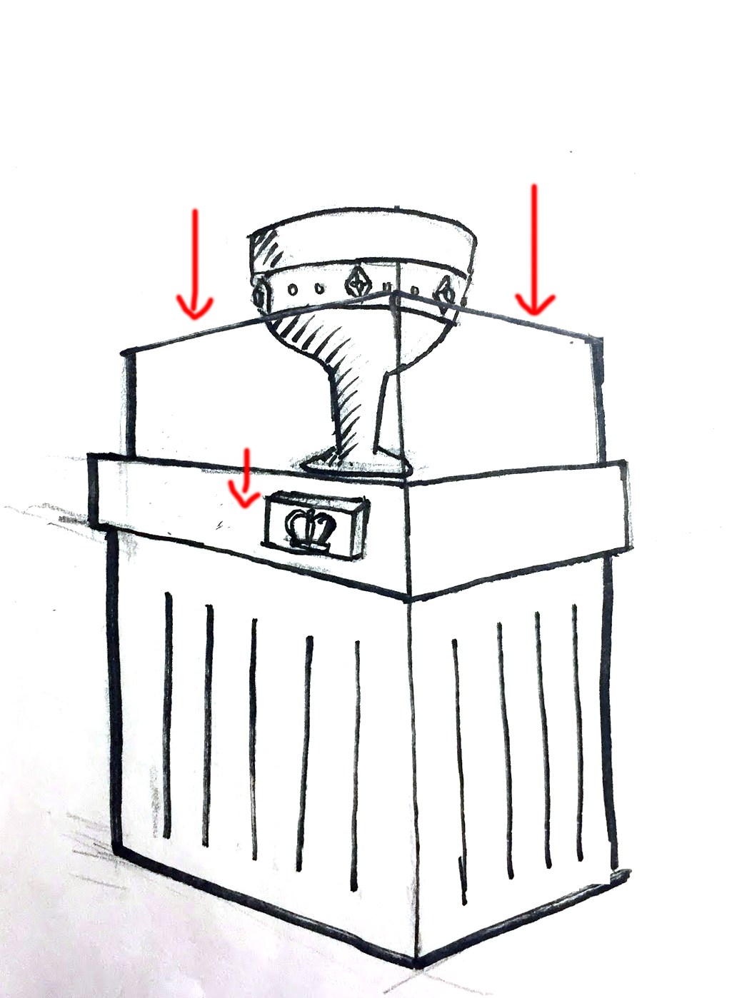 Once the players enter the room, they are greeted by a goblet encased on a display on a pedestal. Once the players make their way around the lasers to the goblet, they will try to get to the the goblet by pressing on the unlock button. If this is done whilst the panel is pressed down to reveal the projection of the room, the location of the unlock buttons around the room will blink.