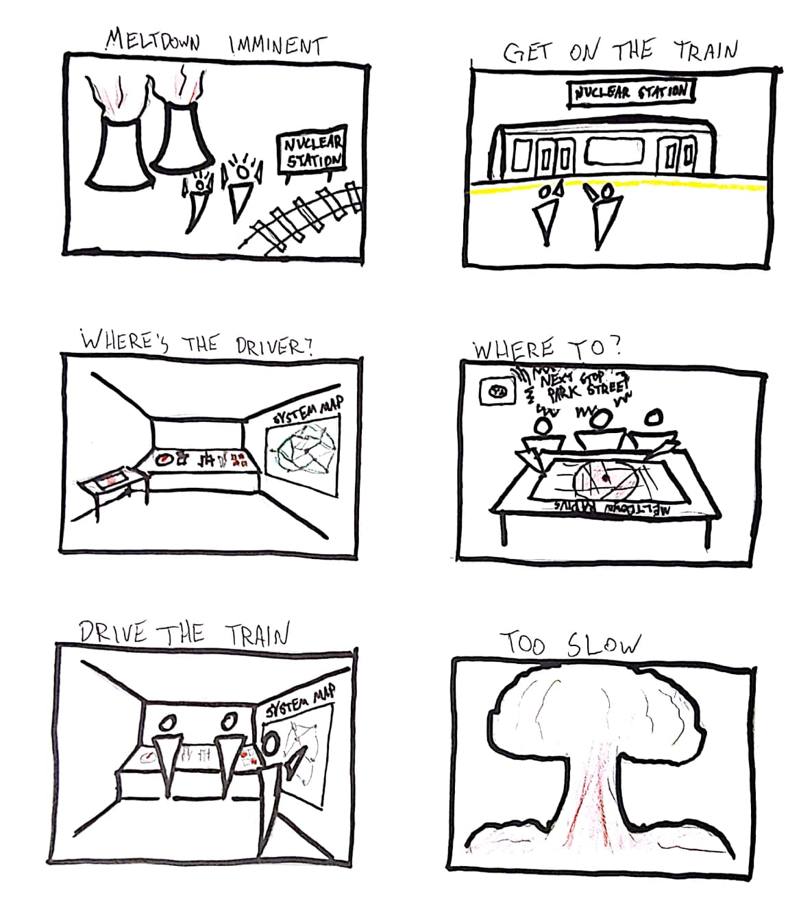 In this scenario our heroes enter a small room with nuclear warning klaxons blaring and they see a door to the nearby train station. They enter the station and board the vacant train, looking to escape from the impending nuclear disaster. A map in the first room hinted at how far they needed to go but if they didn't see it, our heroes will try to drive the train as far away as they can! A system map along with train and track controls allow the team to speed away to safety, but they must avoid the other trains on the track or meet a gory end.