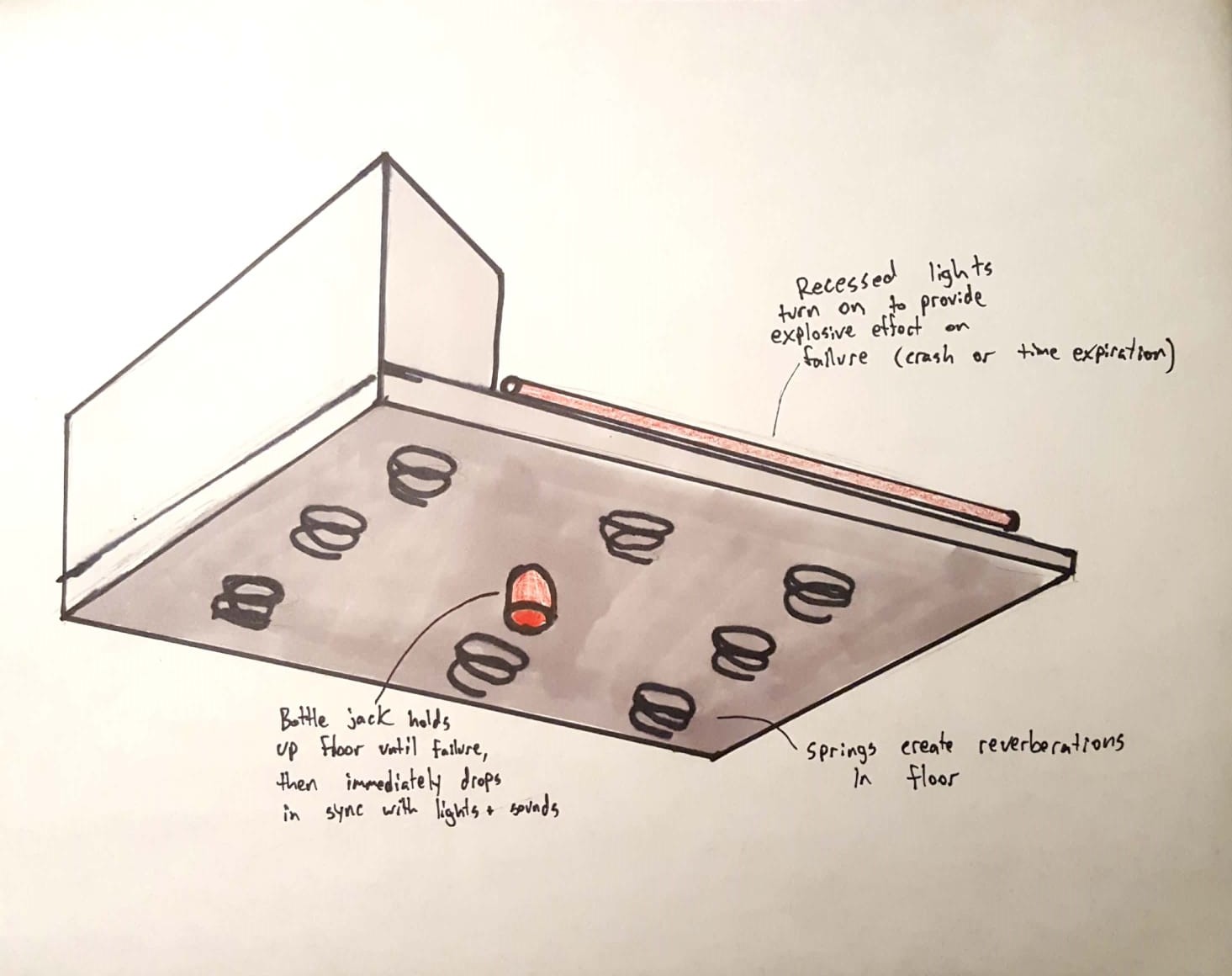 The train's cockpit is mounted on springs and a hydraulic lift. If (when) the visitors fail, the lift will release and the floor will drop a short distance onto the stiff springs. Combined with noise and lighting effects, this shaking will provide clear feedback that either the train crashed or time expired and the nuclear plant exploded.