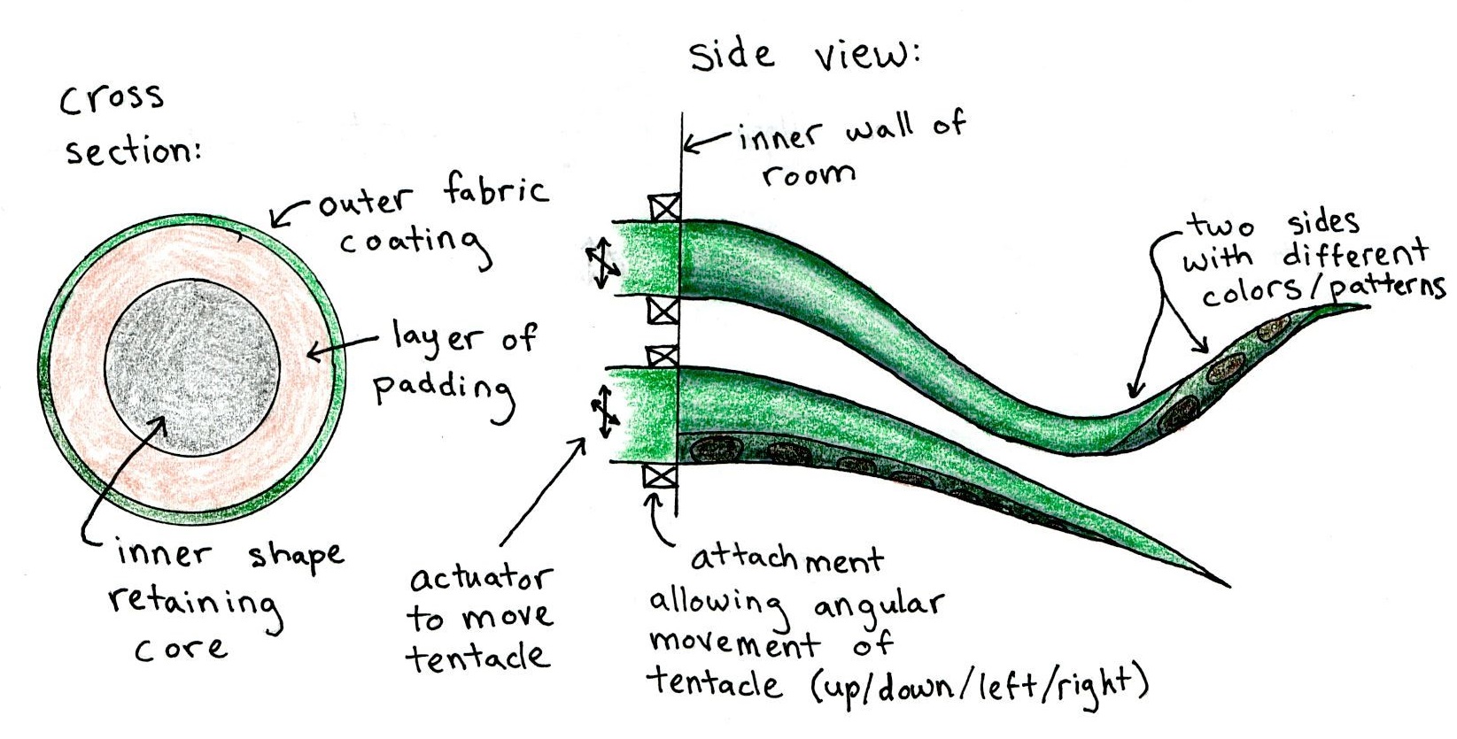 The tentacles are the main element in this room as they are the "monster" the group has to pass. Each tentacle has a roughly conicular shape that is then bent to curve like a tentacle. These items should be covered in fabric which is durable and can be easily cleaned off. The next layer inward should be some sort of padding - think like a pool noodle, so if someone hits a tentacle they won't get hurt. The final inner layer is some sort of material with shape memory so that if a participant bends it, once the force is released the tentacle will regain it's planned shape. The tentacles should be securely anchored into the walls, and in the wall (or in a added casing on the side of the wall) they should be actuated so that they can pivot (at minimum) up and down.