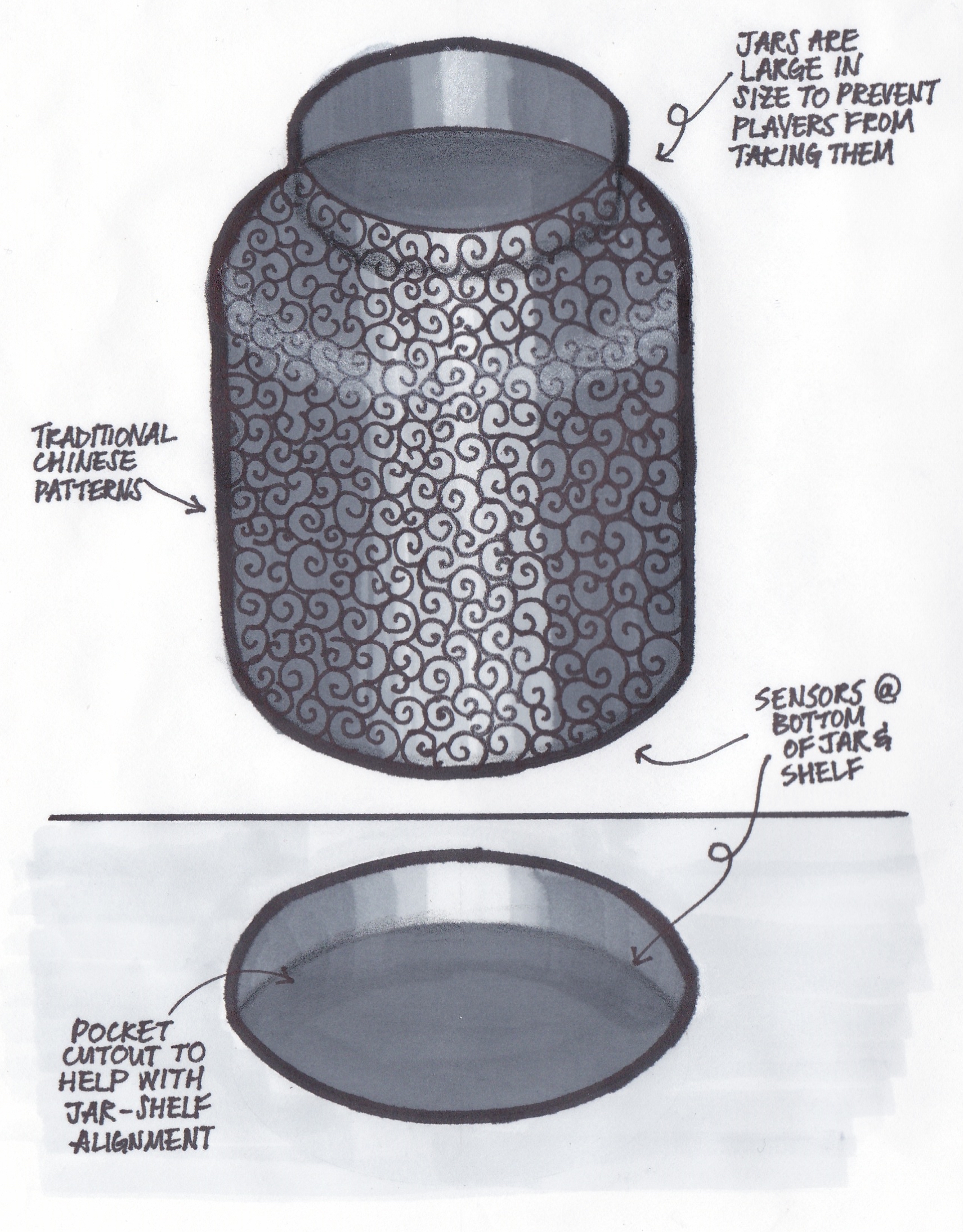 This is a sketch of one of the many tea leaf storage jars (which players would have to rearrange) and its corresponding pocket cutout on the shelf. The jar is going to be large enough that players would not be able to (secretly) carry it out of the room, and it is decorated with traditional Chinese patterns. There will be sensors on the bottom of the jar and the pocket cutout, so that the system knows how many jars the players have put in the right place.