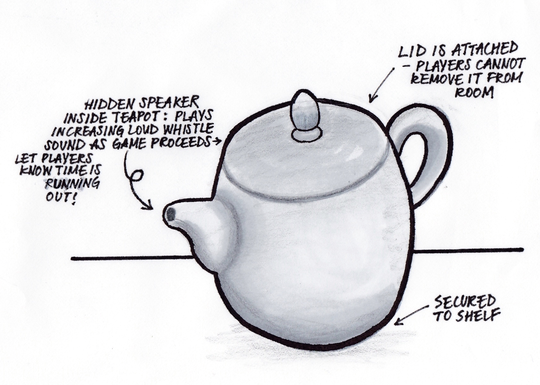 This little teapot is where all the sound effects of the game come from. The lid would be secured to the pot, which would be secured to the shelf (so no one can remove it from the room!) The teapot would make increasingly loud & agitated whistle (or water boiling) sound as the game progresses, so that the players would know when they are running out of time, and have a sense of urgency to finish the task as quickly as possible!